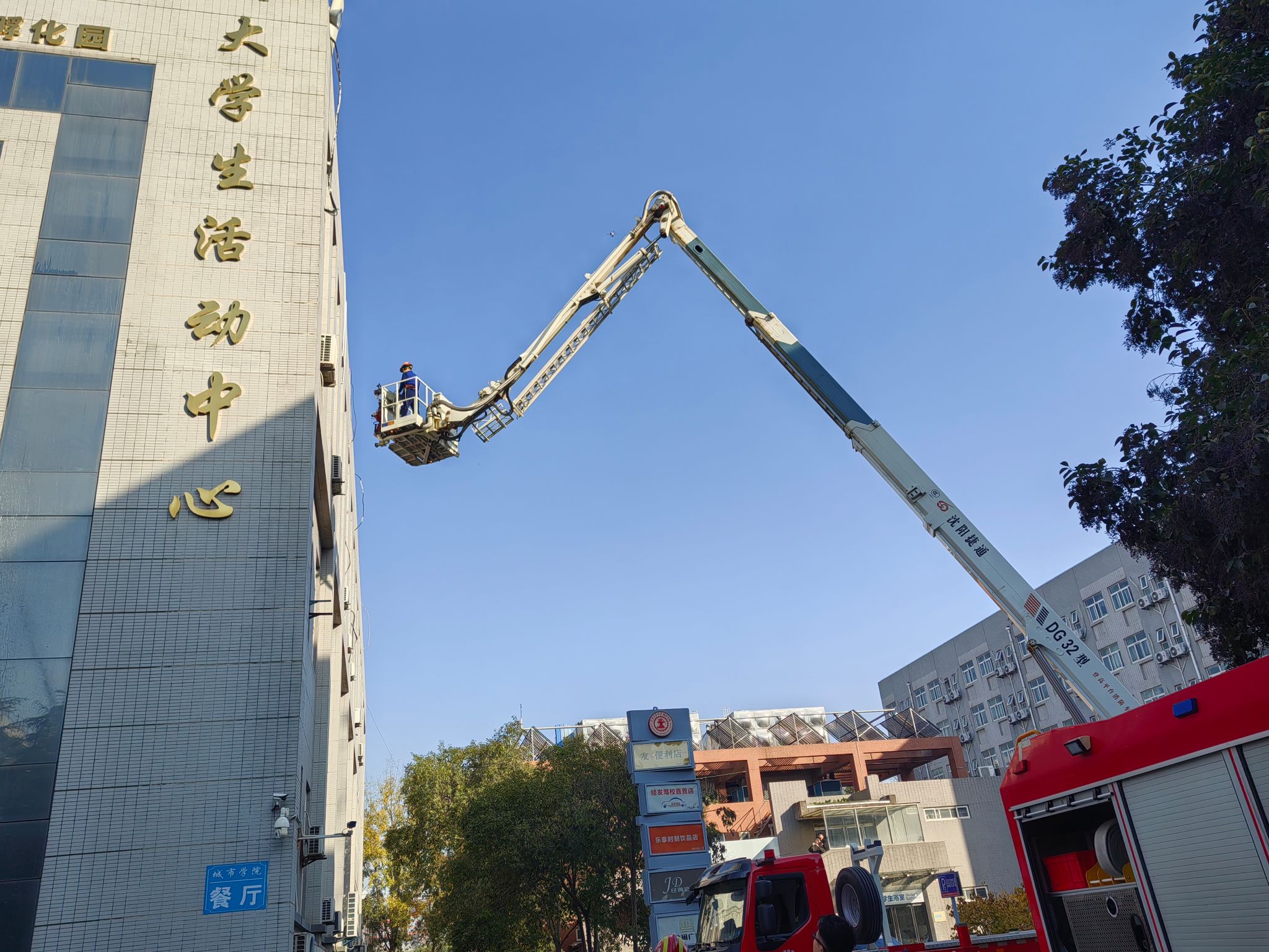 下午3时许,应急疏散演练正式拉开帷幕。演练模拟学生食堂操作间突发“火情”,现场顿时浓烟弥漫,消防应急广播随即响起。听到警报后,食堂内工作人员及模拟就餐的学生在引导下,迅速弯腰低姿,沿指定疏散路线紧张有序地撤离至安全区域。食堂经理发现险情后,立即拨打保卫处值班电话报警。校园微型消防站队员接报后迅速响应,第一时间赶赴现场进行初期火情处置,并同步拨打“119”向专业消防力量求助。鸿明路消防救援站接警后火速出动,消防车辆及时抵达现场。消防官兵们动作娴熟,连接水带,强大的水流精准射向“火点”;同时,救援人员冒着浓烟冲入室内,成功营救出被困“伤员”。守候在旁的校医院医护人员立即上前,对“伤员”进行紧急检查与救治。演练过程中,接到报告称三楼团委办公室有人员因“火势”受困,现场指挥立即调度登高平台消防车展开高空救援,顺利将“被困人员”安全转移至地面。整个演练过程紧张有序、配合紧密,达到了预期效果。
